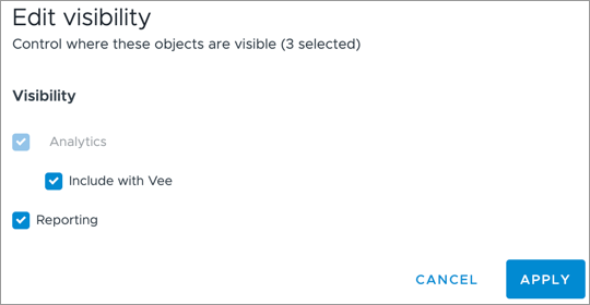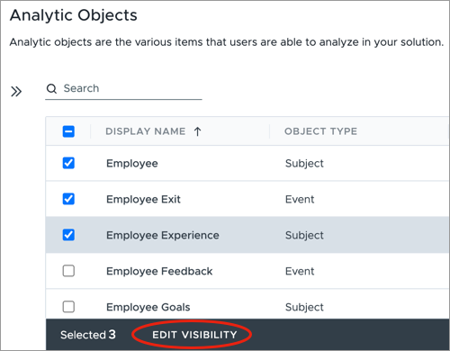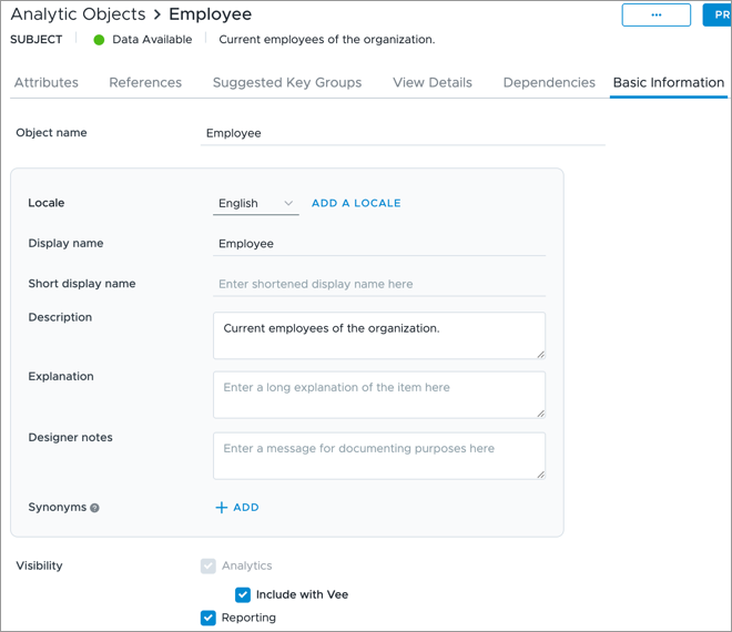 - Removing visibility from an analytic object does not automatically remove it for related dimensions, properties, concepts, or references. These must be managed individually. For example, if you remove reporting visibility for the Job analytic object, you must still remove the visibility for the Job Name dimension.