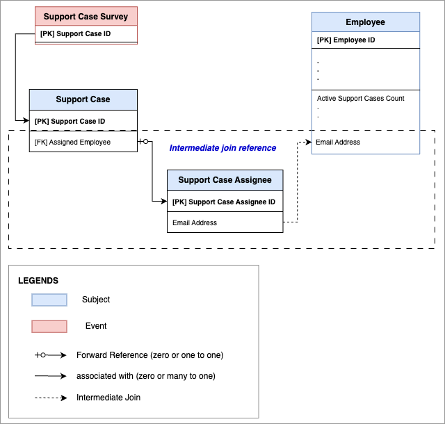 Now, we need to consider how the subject and event are connected to each other. Additionally, we need to connect the support case data with our existing employee data to know which team and customer support agent owns and resolves the most support tickets.