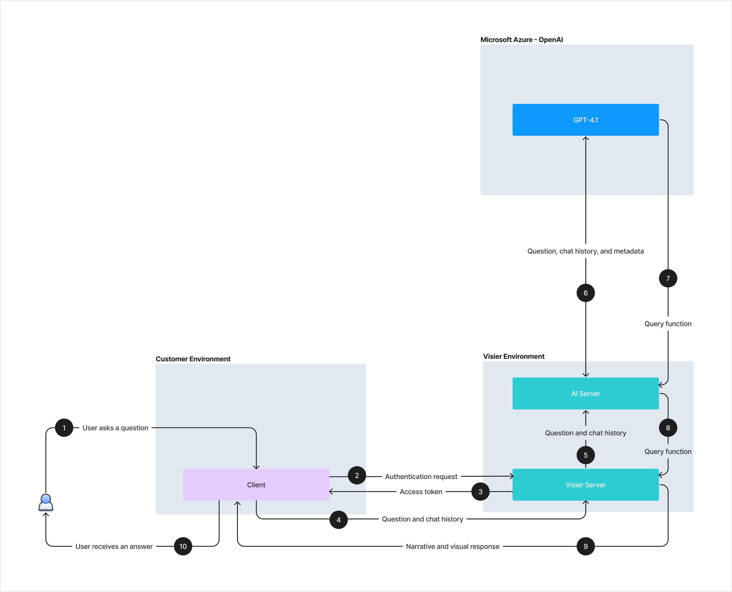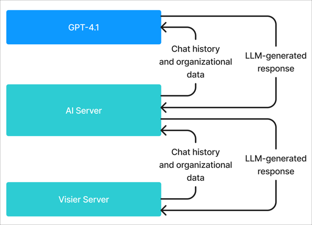 Note: For LLM-generated responses, after the Visier server performs the query function, the organizational data retrieved and chat history makes an extra round trip (from the Visier Server > AI Server > GPT-4.1 > AI Server > Visier Server) before sending the response data to the client. For more information about this feature, see "LLM-generated responses" in Get Started with Vee.