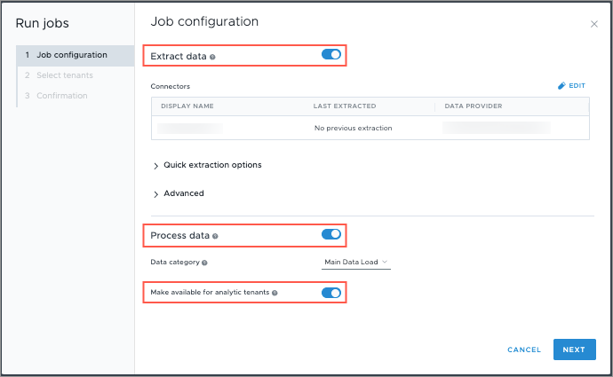 - Optional: To run a data connector extraction job, select Extract data. If running an extraction job, select the Connectors to run jobs for and the extraction options. For more information, see Run a Data Connector Extraction Job.