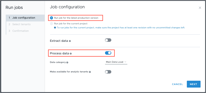 - Run job for the latest production version. This runs a job in the project based on the latest production version. If selected, you can optionally make the data version available to analytic tenants.
