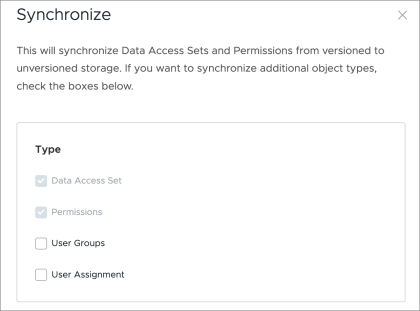 You can choose whether the permissions, data access sets, and user groups are versioned or non-versioned.