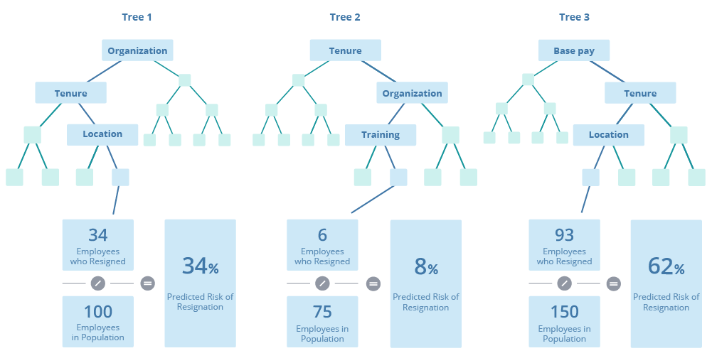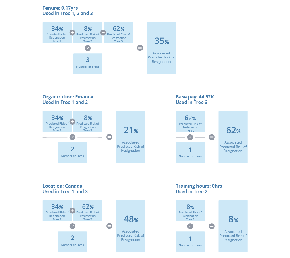 The associated risk of resignation for these attributes is calculated by averaging the historical event likelihoods across the trees where the attribute was used in the prediction, as shown in the following illustration.