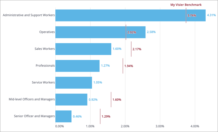Display separate reference lines when you want to provide group-specific context, compare performance across categories, or visualize individual benchmarks for each group within a chart. This approach allows for a fair comparison when groups have inherent differences. For example, showing a single, overall industry benchmark for Employee Exit can be misleading, as the standard can vary significantly across specialized job functions. By using the Metric value reference line type with the Reference line per group option, you can compare each function's performance against its own specific Visier Benchmark.