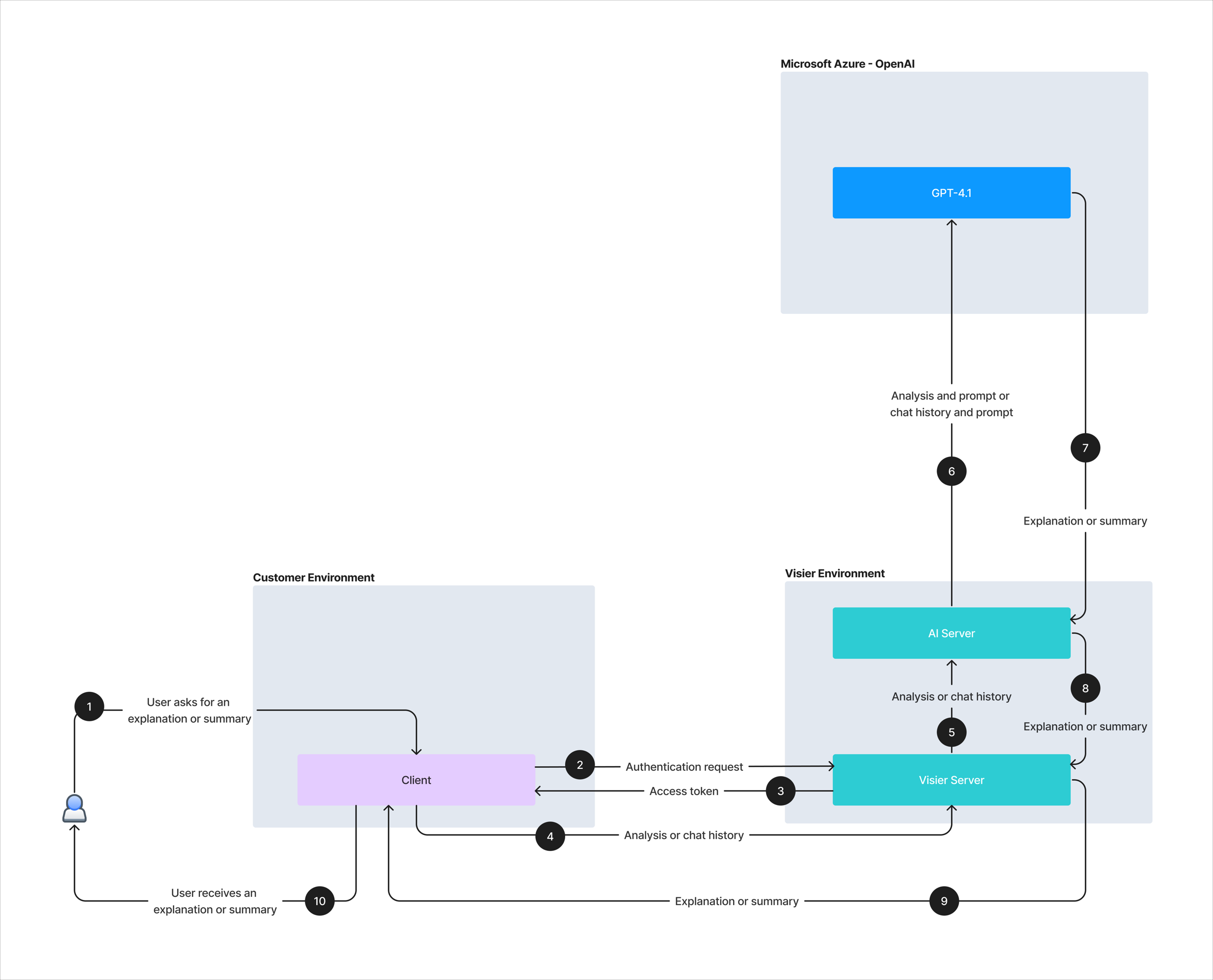 - A user requests an AI explanation in a Vee Board (analysis) or a summary of their conversation with Vee on the client side in Visier People.