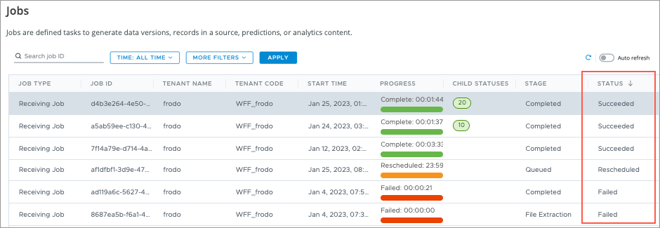 Progress | Indicates the progress and duration of a job for its current stage. If Auto Refresh is enabled, the progress bar updates every 10 seconds. You can also click Refresh to see the progress of the job in real time. |