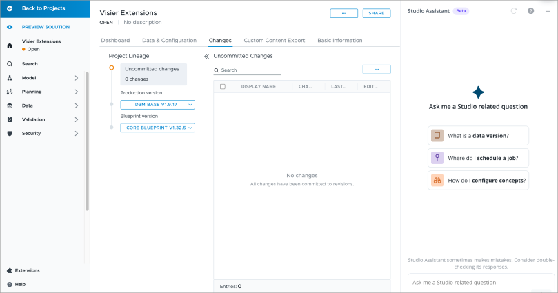 When you enter Studio, you'll land in the global workspace, specifically the Projects room. All changes made in the global workspace must be saved to take effect. These changes will take effect immediately and cannot be rolled back because they exist outside of the project lifecycle. The majority of the time, you'll be working in a project. Projects are how Visier handles version control, allowing you to define and edit the solution separately from the current production version of the solution. In a project, the changes that you make to the solution do not automatically go into effect until they've been reviewed, approved, and published. For more information, about the projects lifecycle, see  Projects.