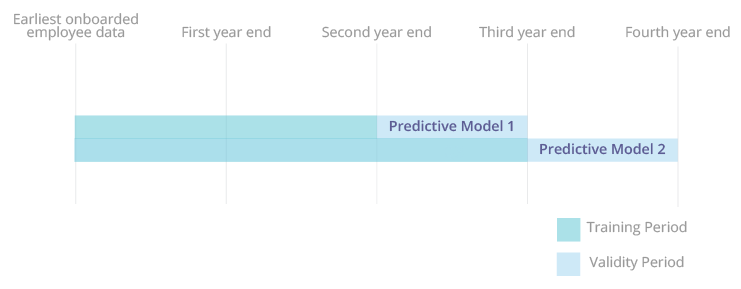 The prediction values are valid for the point in time which the employee attributes used to make the predictions are retrieved. Predictions estimate the likelihood that the target employee event (for example, a resignation) will happen in the 365 days following the prediction.
