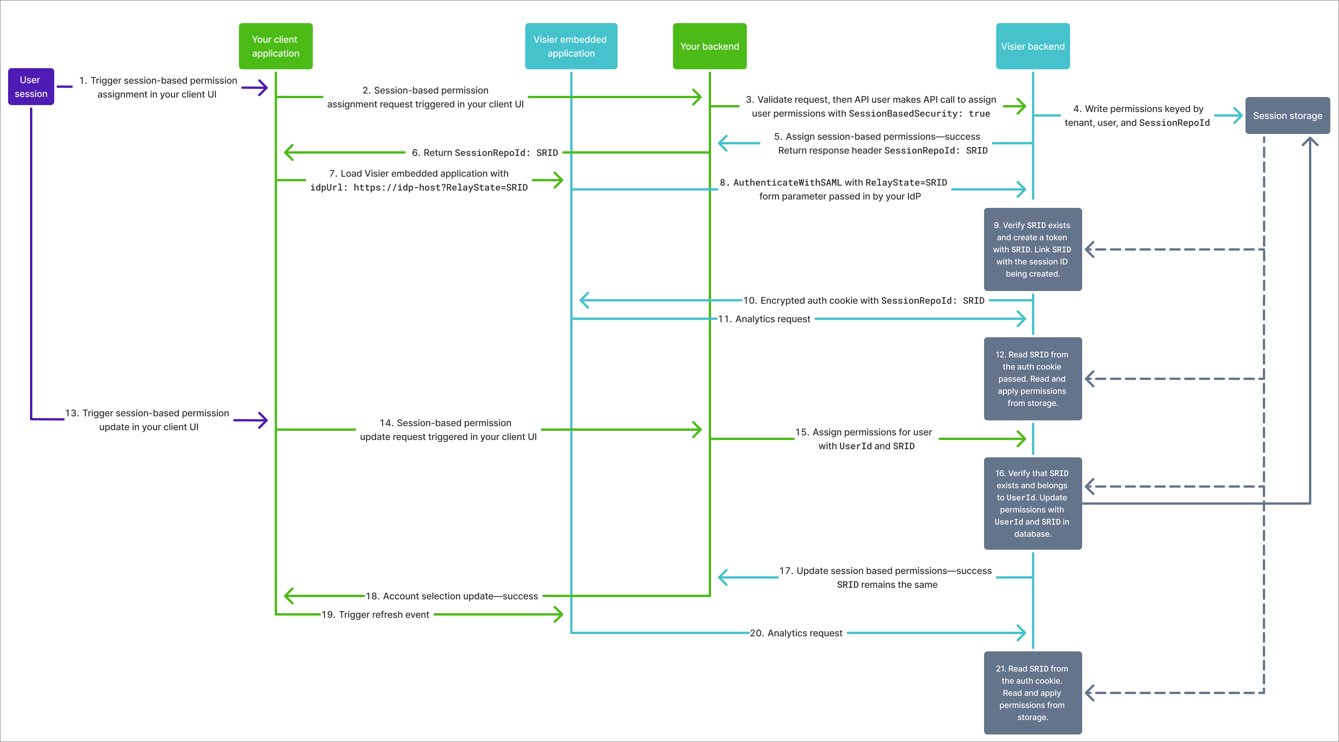 The following diagram shows the workflow to assign session-based permissions.