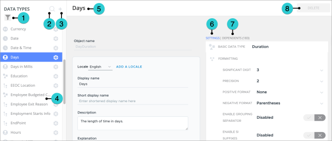 Visier data types control how data records are displayed. You can create new data types or modify existing ones to meet your specific needs, controlling details such as decimal places, negative number presentation, and the use of SI suffixes.
