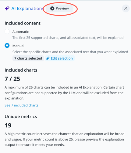 • Control your narrative by selecting the visuals and text to include in the AI explanation, then previewing the generated results.