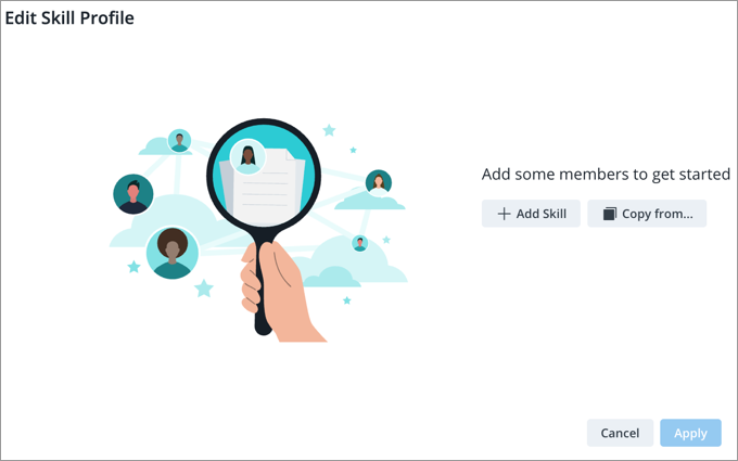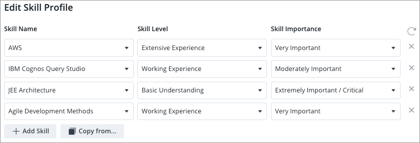 To copy an existing set of skills from a related subject, such as Employee or Job, click Copy from. For example, you can select an employee to populate the skill profile with that employee’s skills and corresponding skill level.