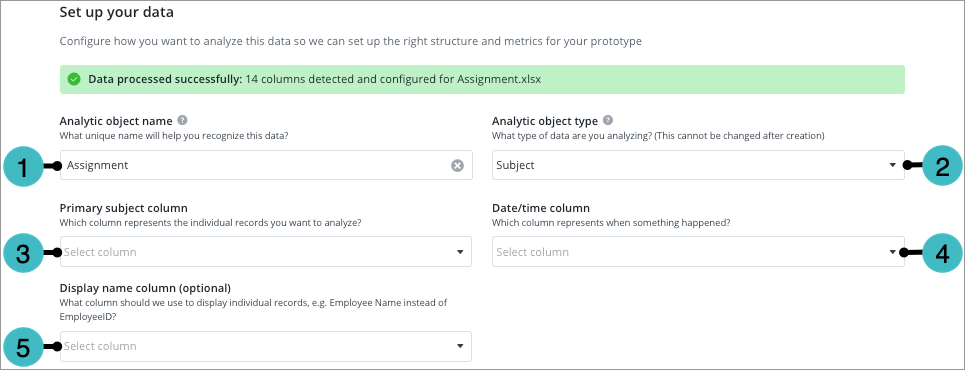 The columns you selected during prototype creation to represent the analytic object. In the configuration summary, you can change the primary subject column, date/time column, and display name column.
