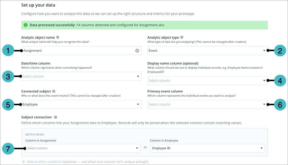 - Select the Primary subject column. This is the unique identifier that represents individual records, such as an Employee ID.