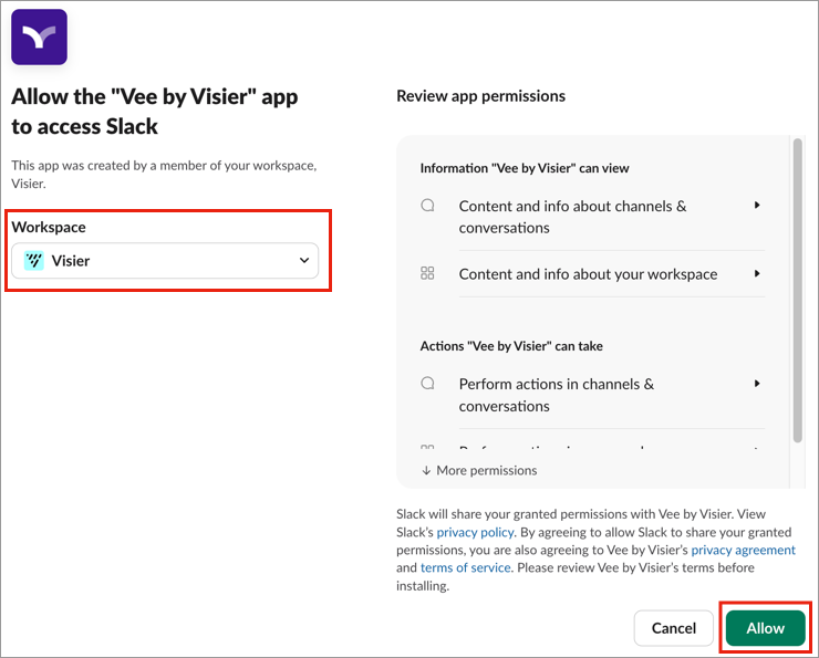 /vee-signinto bring up the Sign in message and click the Sign In button. The sign in link expires in 2 minutes. If you have not signed in to Slack before, you may be prompted to enter your Slack workspace.Result: The Allow the "Vee by Visier" app to access Slack page opens in a new browser tab.