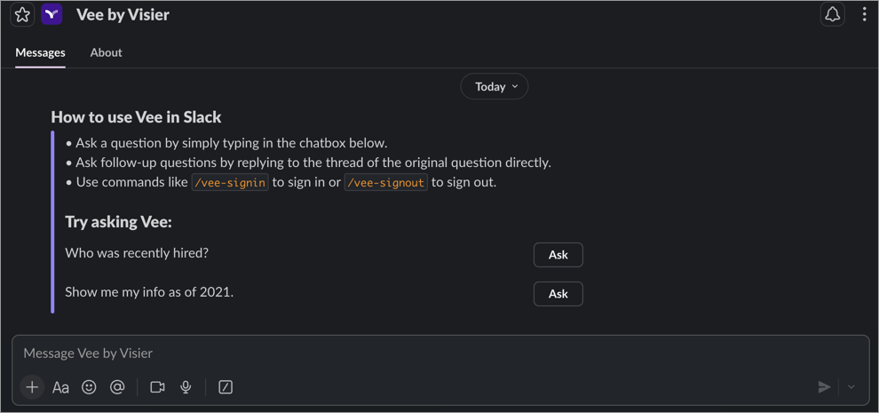 Note: Vee only works in direct messages. Sending messages in channels or group conversations will prompt you to send a direct message in the Vee by Visier chat instead.