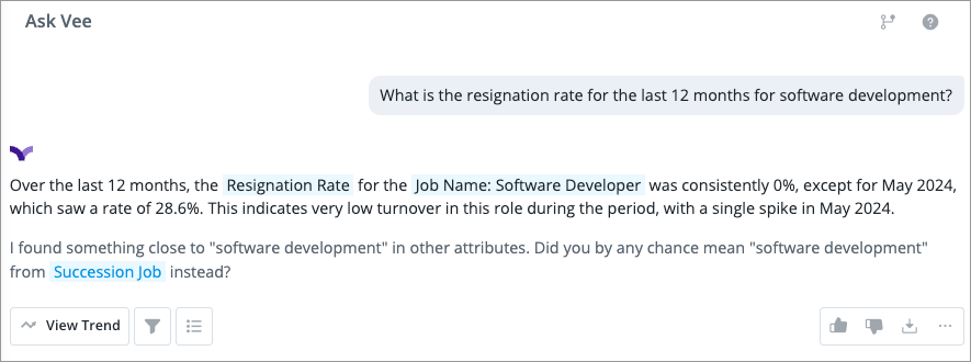 Ask Vee any question about your workforce and it will try to provide an answer based on your organization’s people data. It excels in providing answers about current events and past occurrences. Questions starting with "which," "where," "how," and "who" are typically well-suited for Vee's capabilities.