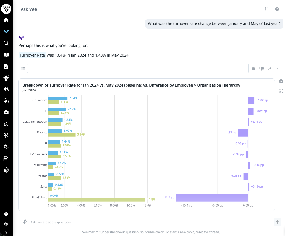 Is this your first time using Visier People? Not sure what metric will answer your business question? Don't know how to ask questions that provide actionable insights? Finding the answer to your business questions has never been easier with Vee. There’s zero learning curve. Just use plain English to ask any question about your workforce and get an accurate narrative answer based on your organization’s people data within Visier.