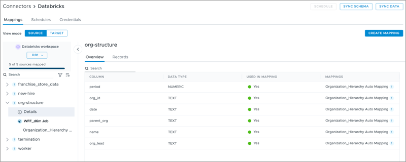 In Source view, the mappings are grouped by source, which contains the raw data before processing. The number next to each source shows how many mappings it is used in. The Details page provides an overview of the source columns and which mappings they are being used in and allows you to preview the records in the source. Select a connector credential to view mappings that uses sources from Databricks.