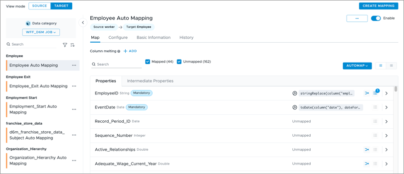 The Mappings tab has two views: Source and Target. Source view groups mappings by source, which contains the raw data before processing, while Target view groups mappings by the objects in the Visier analytic model that the data is loaded into. Source view helps you identify unused source columns that still need mapping, while Target view is useful for configuring mappings one data category at a time.