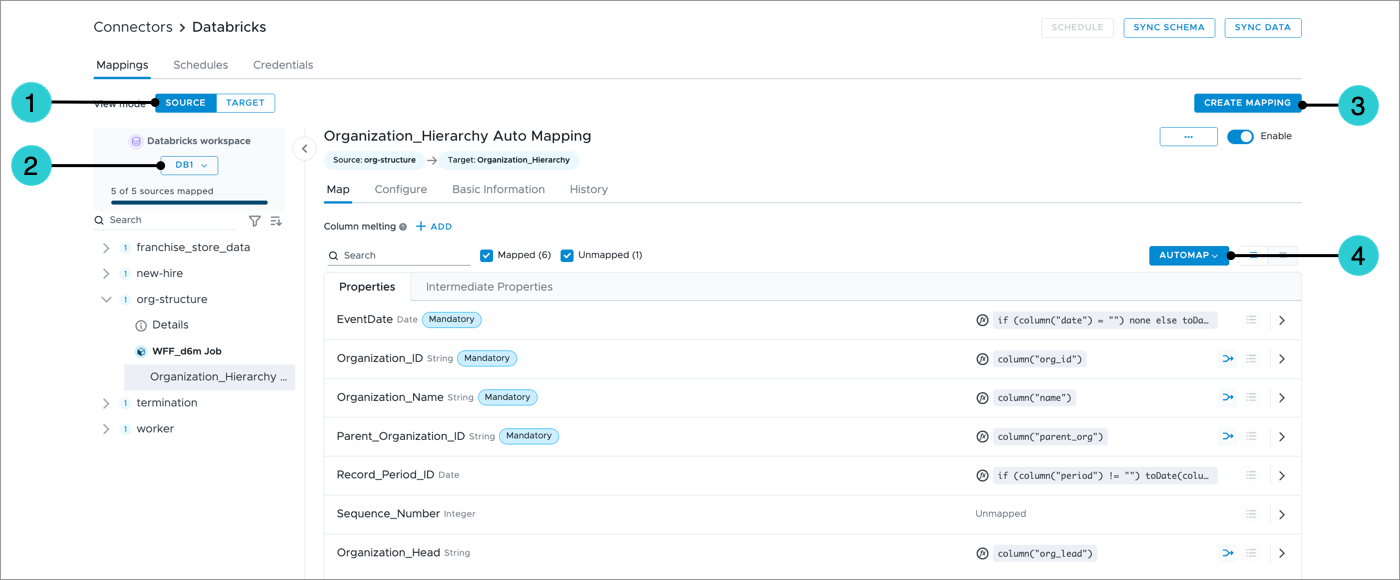 - Review the AI-created mappings or create them manually. To configure mappings, open the Databricks connector by clicking Data > Connectors on the navigation bar. For more information, see Update mappings.