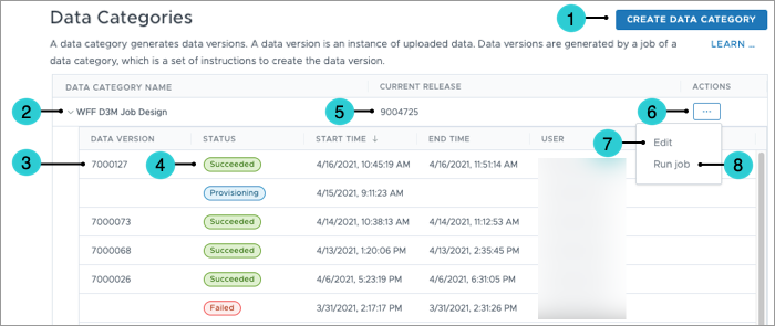 - Run job: An action that runs a job to generate a new data version for the data category.
