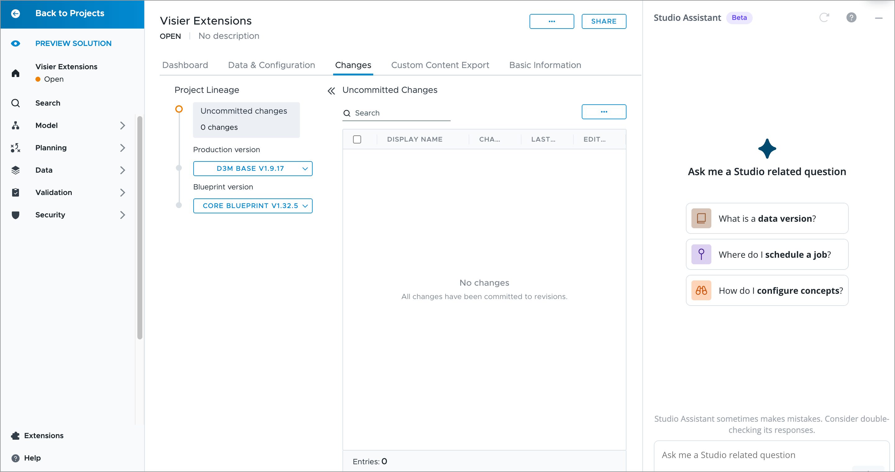 When you enter Studio, you'll land in the global workspace, specifically the Projects room. All changes made in the global workspace must be saved to take effect. These changes will take effect immediately and cannot be rolled back because they exist outside of the project lifecycle. The majority of the time, you'll be working in a project. Projects are how Visier handles version control, allowing you to define and edit the solution separately from the current production version of the solution. In a project, the changes that you make to the solution do not automatically go into effect until they've been reviewed, approved, and published. For more information, about the projects lifecycle, see Projects.